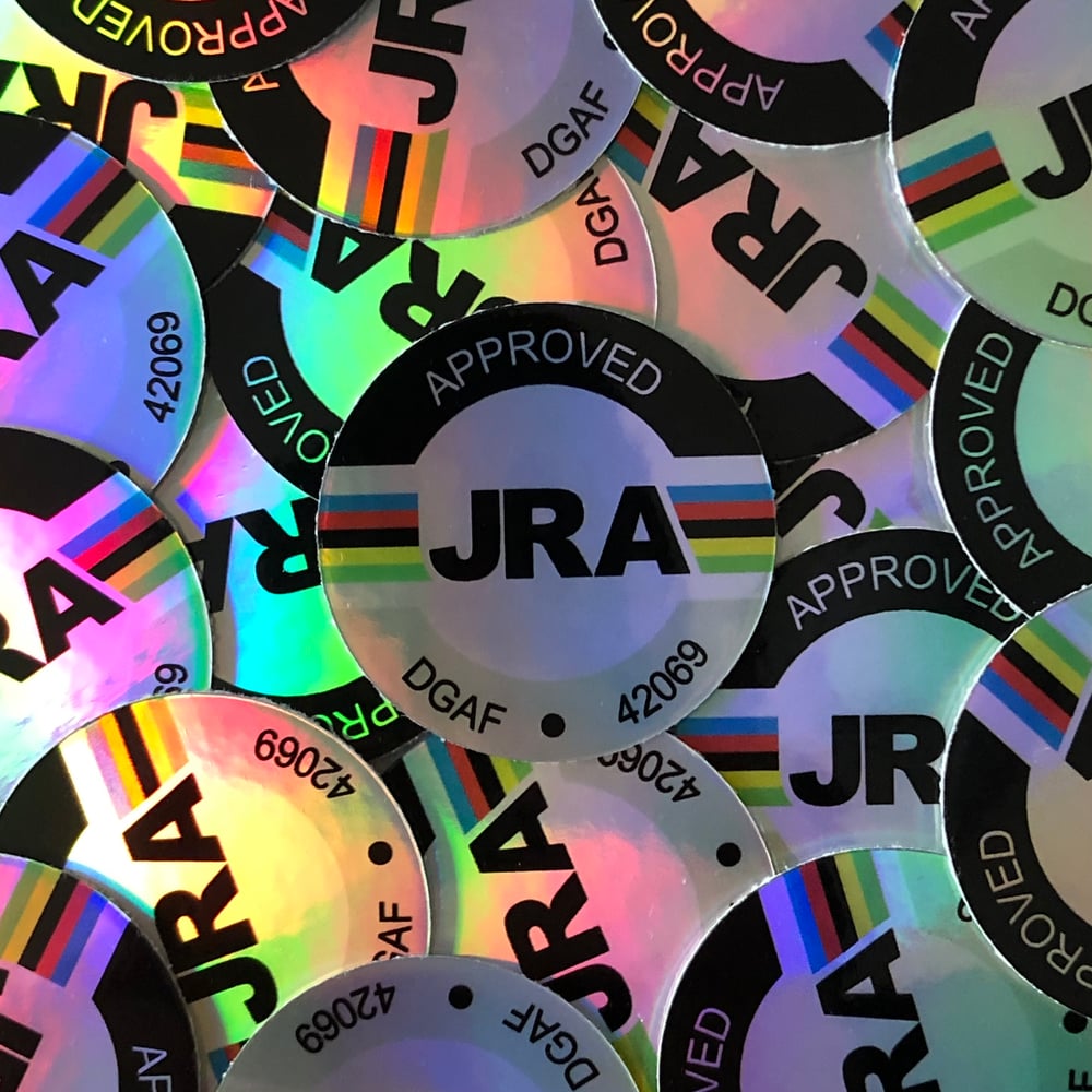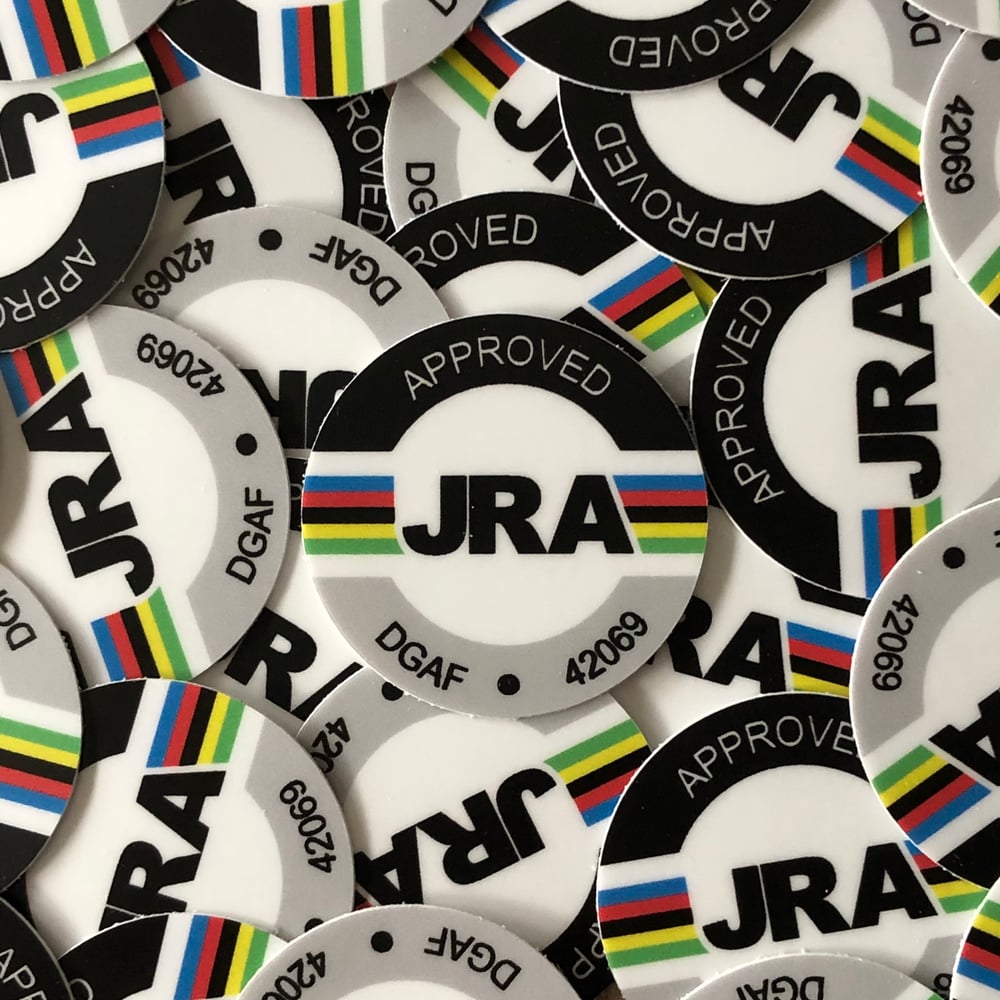 I made these funny little stickers that fit over the frame approval stickers of a certain international governing body's approval stickers. Hopefully your dad doesn't have to ask you what each acronym on the sticker means :)